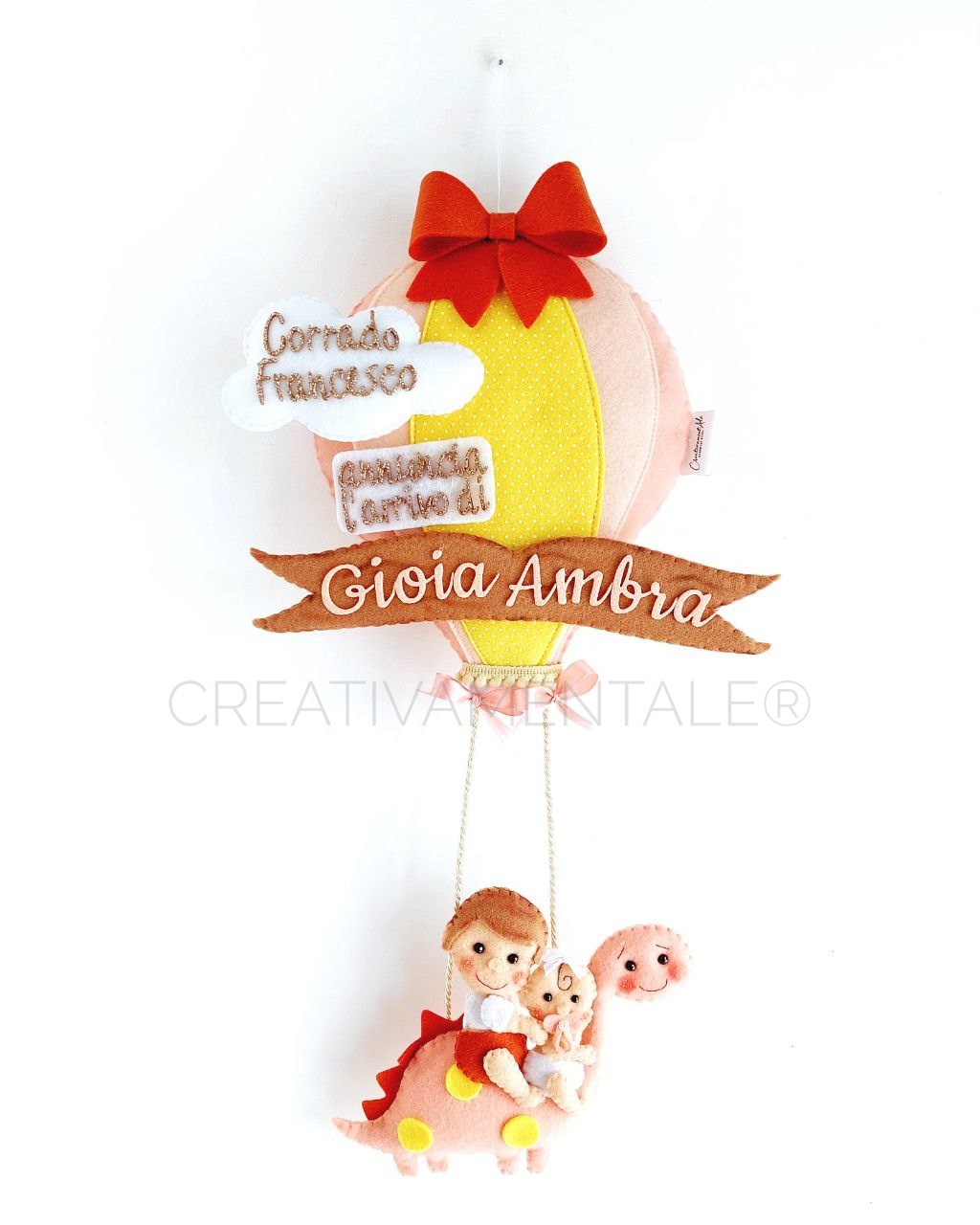 Il fiocco nascita mongolfiera è composto da elementi in pannolenci: fiocchetto, nuvoletta, banda con frase (rimovibile in un secondo momento), banda con nome, mongolfiera, dinosauro con bimbi in groppa; nomi + frase in gomma eva glitter.