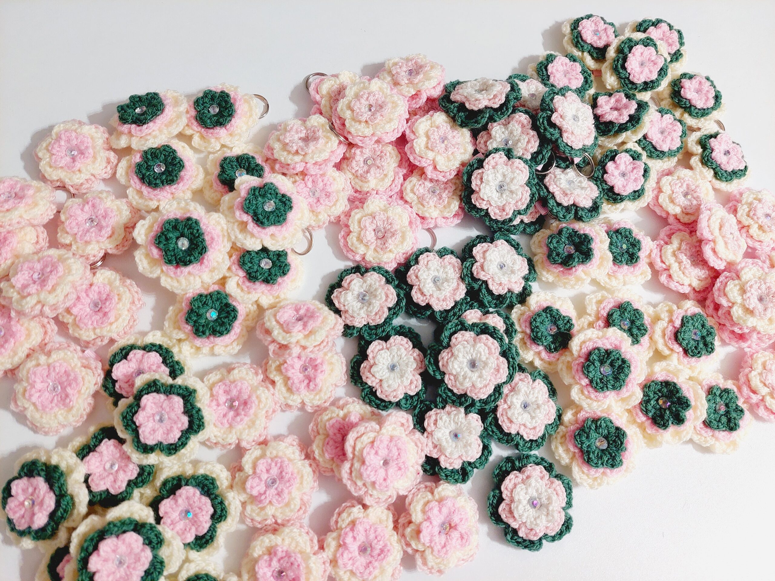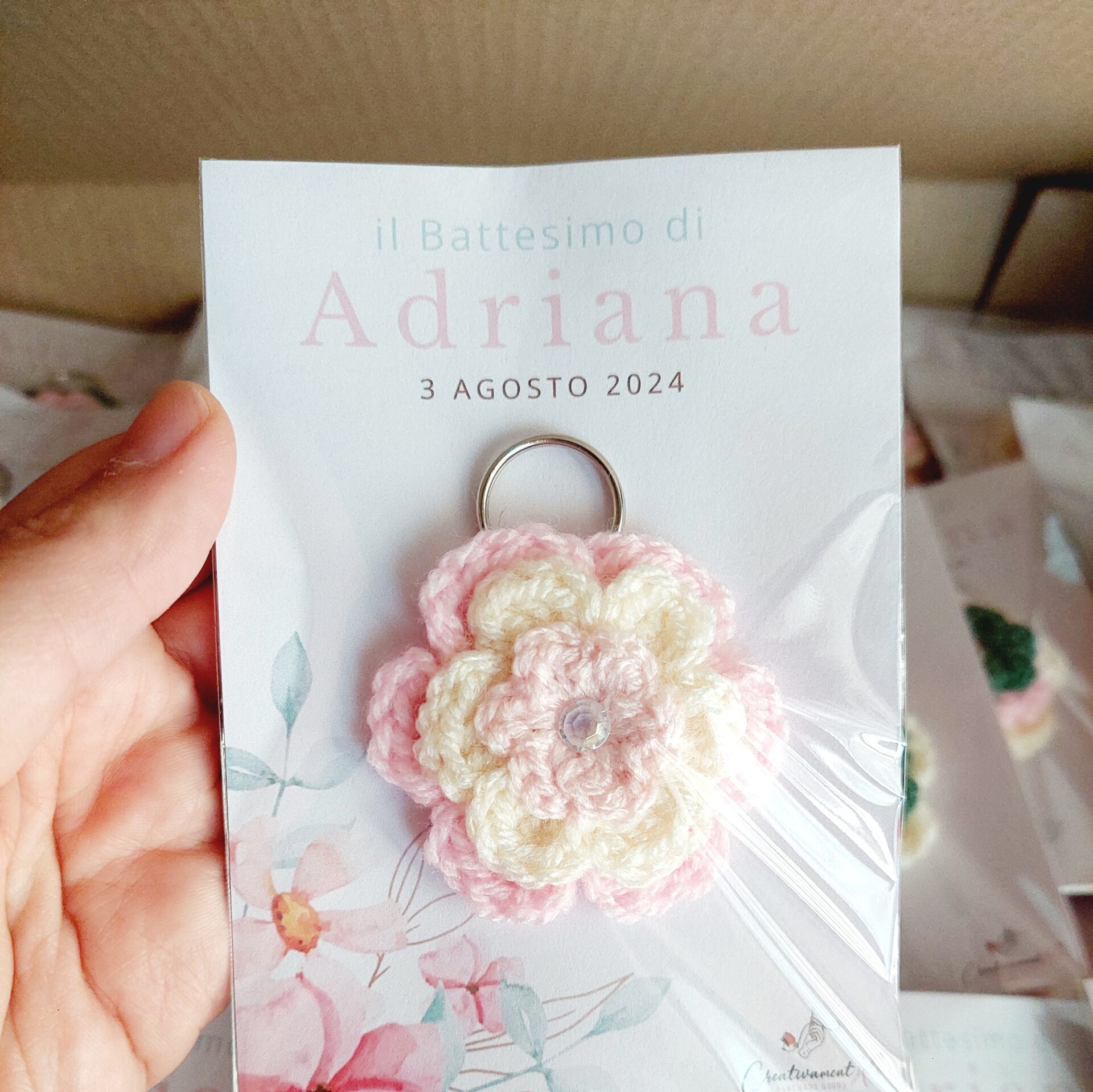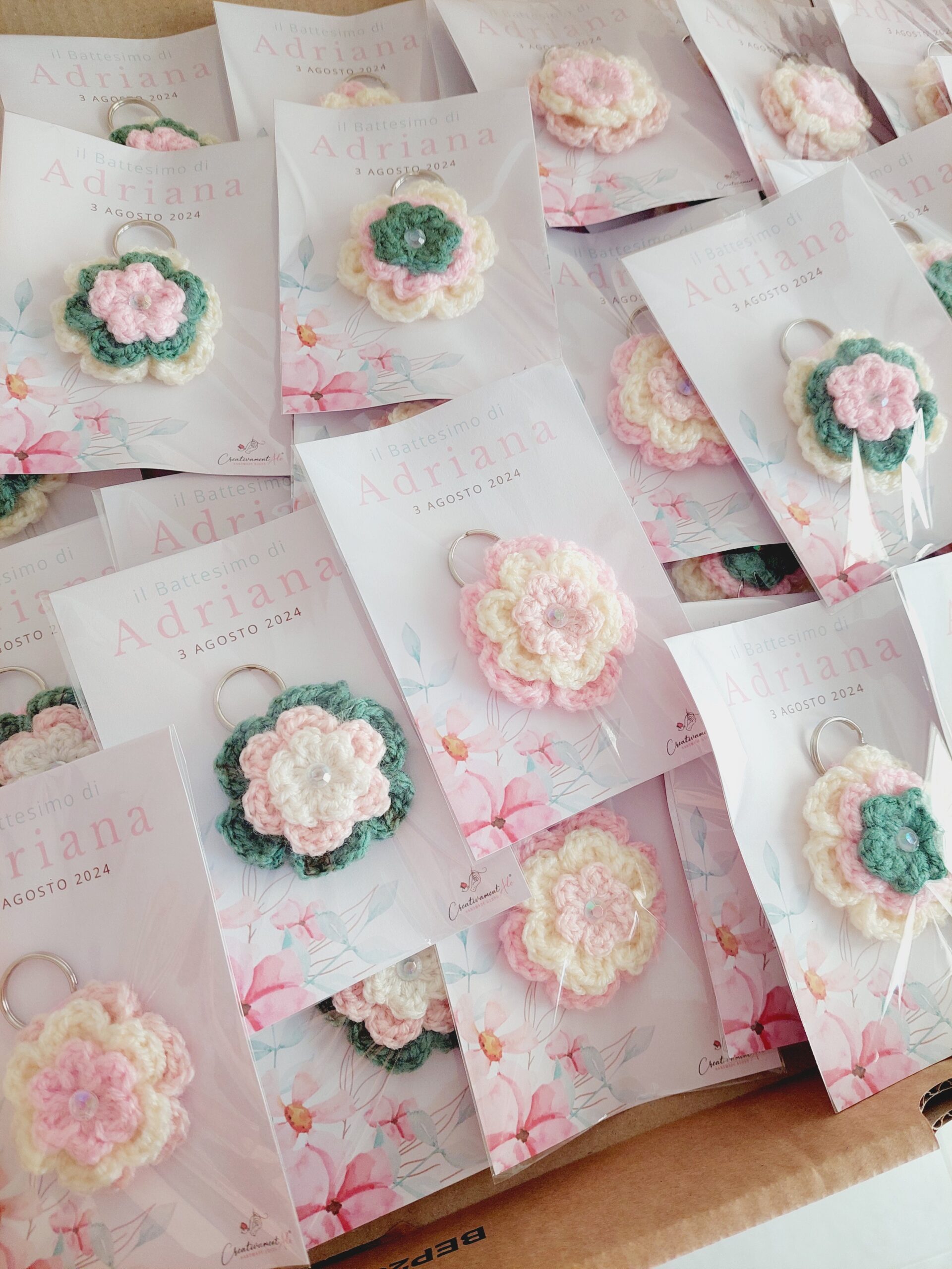 Portachiavi bomboniera fiorellini uncinetto per battesimo o nascita